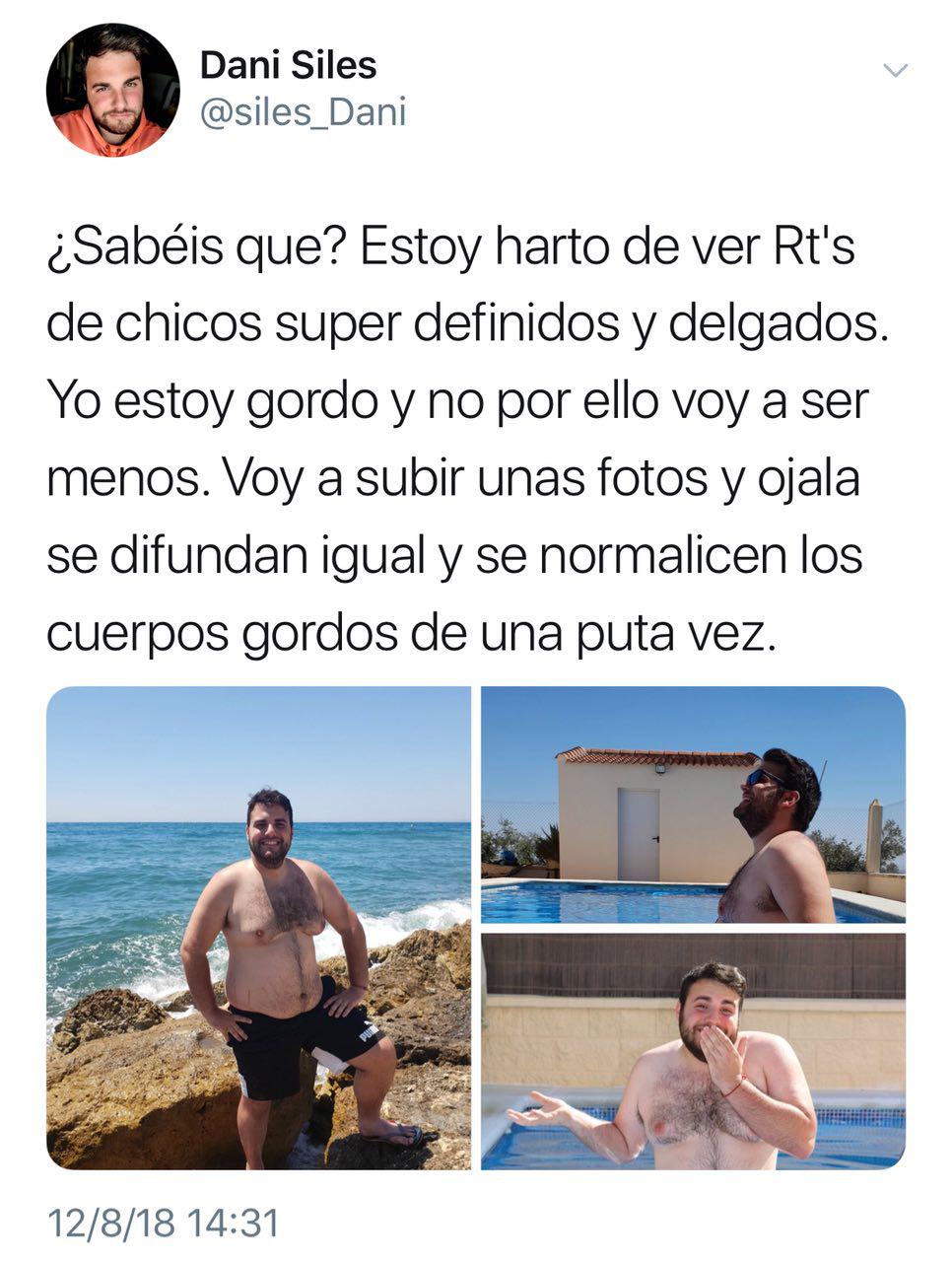 Decía: ¿Sabéis qué? Estoy harto de ver Rt’s de chicos super definidos y delgados. Yo estoy gordo y no por ello voy a ser menos. Voy a subir unas fotos y ojalá se difundan igual y se normalicen los cuerpos gordos de una puta vez.