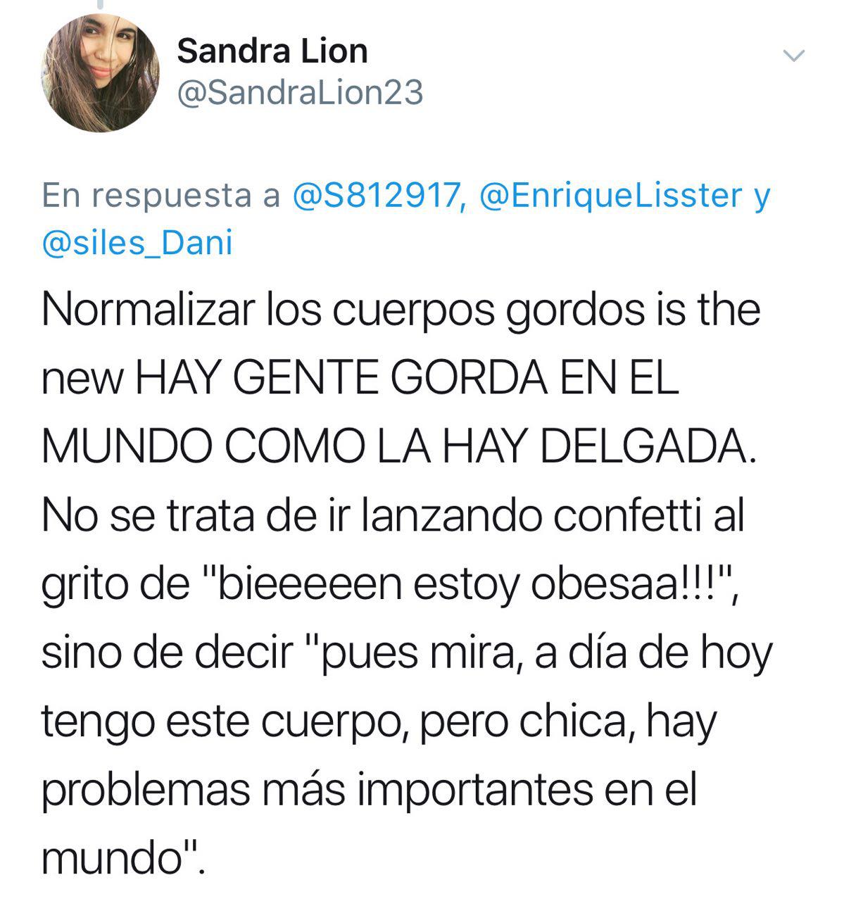 Decía: ¿Sabéis qué? Estoy harto de ver Rt’s de chicos super definidos y delgados. Yo estoy gordo y no por ello voy a ser menos. Voy a subir unas fotos y ojalá se difundan igual y se normalicen los cuerpos gordos de una puta vez.
