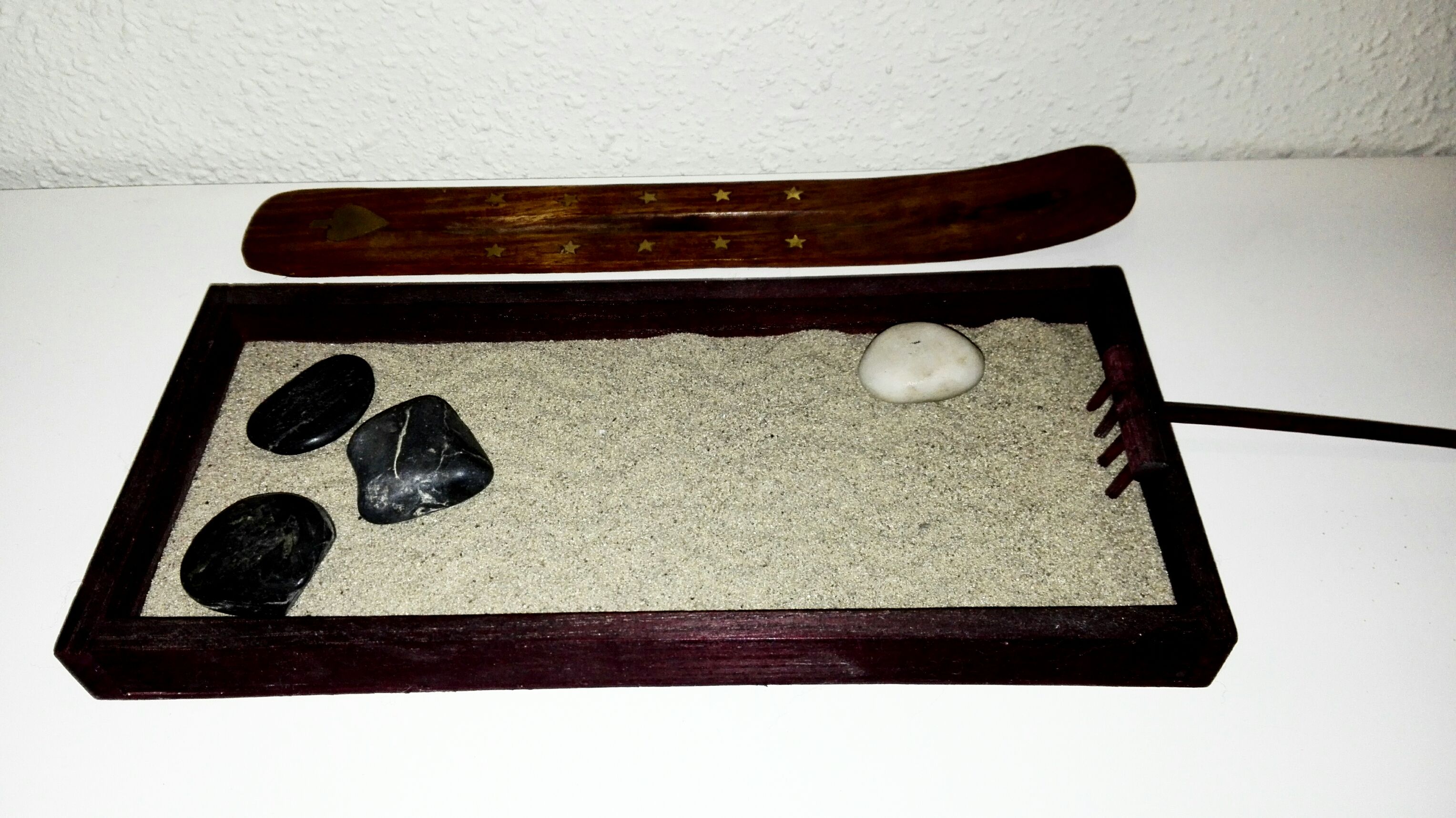 Hace mucho tiempo, me regalaron un jardín japonés en miniatura y lo puse en el mueble de la entrada de mi casa. Le he ido dando distintos usos con el paso de los meses: Al principio fue sólo decorativo, porque en aquel momento no tenía paciencia ni serenidad para «estas chorradas», más tarde lo usaba de vez en cuando para simbolizar situaciones: las piedras negras podían representar mis debilidades y la blanca mi fortaleza (en aquel tiempo no sentía que tuviese muchas más) y las iba colocando estratégicamente, formando un sistema. También los dibujos con el rastrillo en la arena cobraban significado: podía dibujar ondas o líneas rectas si estaba tranquila, o trazaba en zigzag si me sentía agitada. Si alguien hubiese sabido el uso que le daba a mi jardín japonés, hubiese podido averiguar cómo me sentía tan sólo atravesar el umbral de mi hogar.